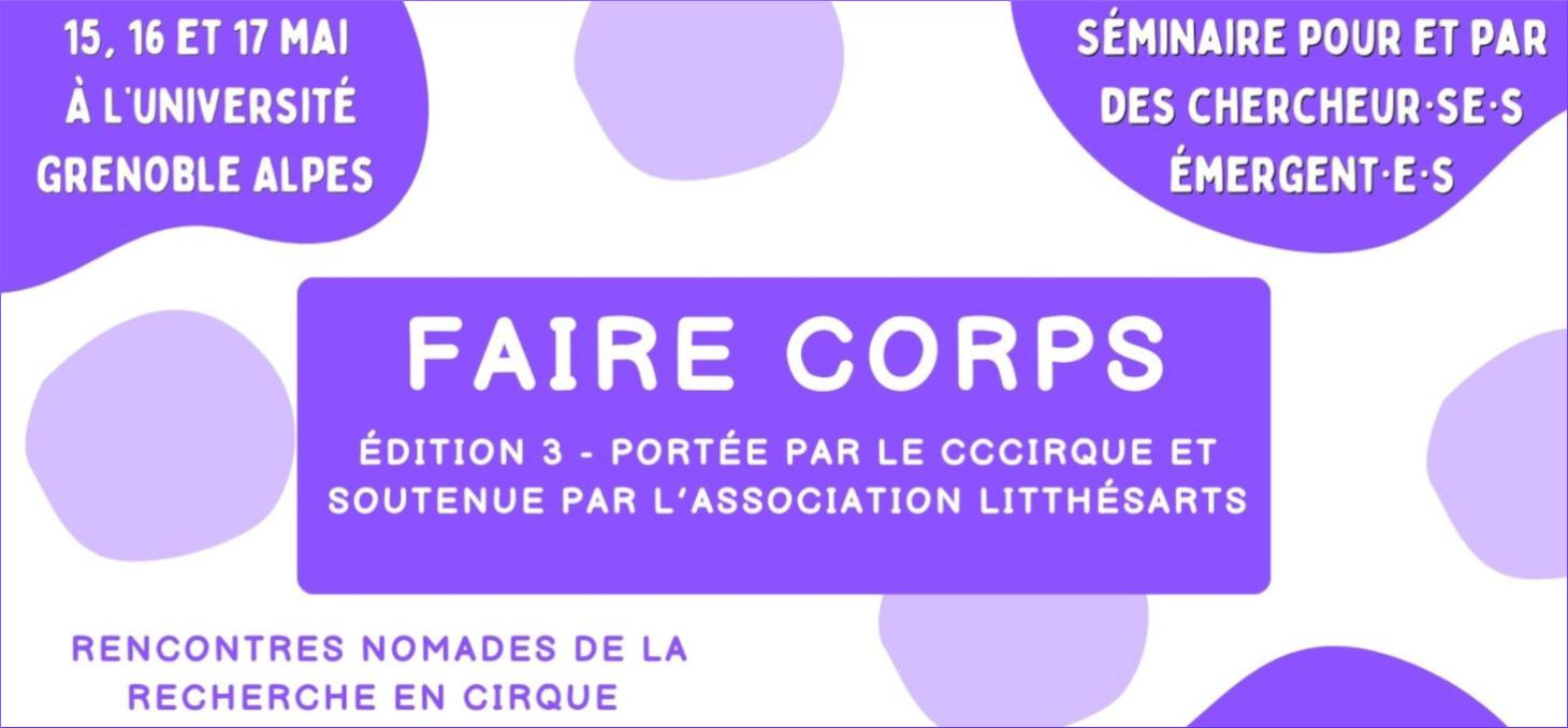 « Faire Corps – Rencontres nomades de la recherche en cirque » est un séminaire doctoral qui a vocation à valoriser les avancées des personnes nouvellement engagées dans la recherche en cirque. Soutenu par le CCCirque, « Faire Corps » vise à faciliter les échanges avec les artistes et les professionnel·les du milieu du cirque, à initier des collaborations entre la recherche et la pratique, autant qu’à rendre les processus de recherche universitaire et ses productions plus visibles. « Faire Corps » est pensé à destination des étudiant·es, masterant·es, doctorant·es, post-doctorant·es, artistes, amateur·trices et chercheur·euses nouvellement engagé·es dans la recherche (sans restriction d’âge) qu’ils ou elles soient lié·es, ou non, à une institution. Les chercheur·euses émergent·es peuvent profiter de « Faire Corps » pour partager leurs recherches en cours dans un cadre convivial et interactif, et remédier ainsi à l’isolement de la recherche (pour plus d'informations, voir le Manifeste en encadré).